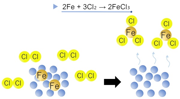 塩化揮発法とは、金属酸化物や鉱石などの無機物に塩素ガス(Cl₂)や塩化水素(HCl)を反応させ、揮発性の金属塩化物に変換して分離・精製する方法です。