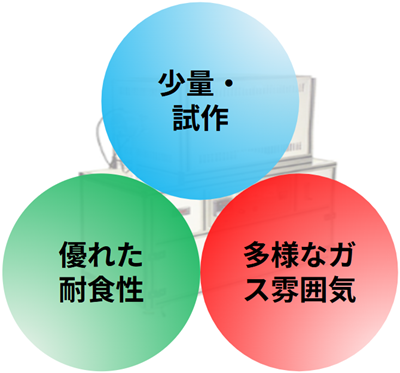 - 各種ガスを流しながら加熱でき、雰囲気条件の自由度が高い小型・安価で研究開発や試作用途に適する