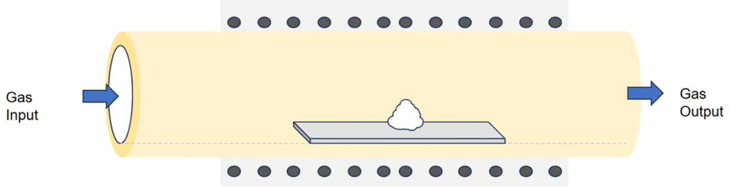 管状炉は、円筒状の加熱部(セラミックス反応管)にサンプルを配置し、様々な雰囲気ガスを流しながら加熱処理を行うコンパクトな炉です。小型・低コストでありながら、流量・圧力・温度の測定が可能なため、反応条件の評価や試作研究に適しています。