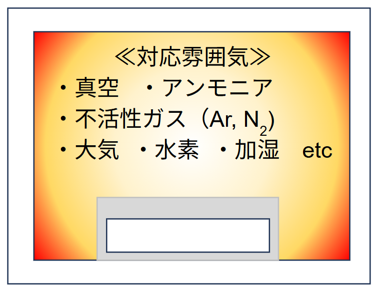 - 真空、不活性雰囲気(N₂、Ar)、酸化雰囲気(O₂)、還元雰囲気(H₂、NH₃)まで対応